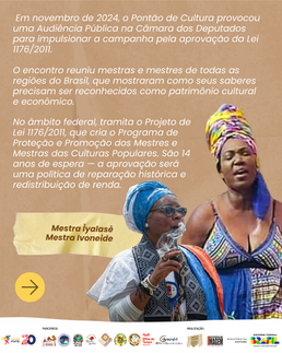 No âmbito federal, tramita o Projeto de Lei 1176/2011, que cria o Programa de Proteção e Promoção dos Mestres e Mestras das Culturas Populares. São 14 anos de espera — a aprovação será uma política de reparação histórica e redistribuição de renda.